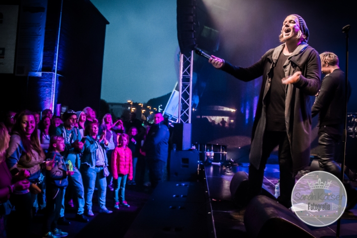 Kennt ihr das Gefühl einen Freund wiederzutreffen den man lange nicht gesehen hat?! So erging es mir gestern mit Kieron. Es kann vielleicht auch daran liegen, dass er mich total an einen alten lieben Musikfreund von mir erinnert. Von seinem Aussehen, seiner Art und seiner Musik. 😀 😉 Wie auch immer, ich habe ihn das erste mal gestern gesehen und live erleben dürfen. Und das wird bestimmt nicht das letzte Mal gewesen sein. Seine Musik sind neue und alte Coversongs von Rock bis Pop. Adeles „rolling in the deep“, Prince „purple rain“ oder „sex is on fire“ von den Kings of Leon, um mal ein paar zu nennen. Auch „Tage wie diese“ von den Toten Hosen durfte vor einer super Kulisse der Zeche nicht fehlen, denn Esther Kim, die auch an den Keys der Hosen steht, spielte gestern mit in der Band. Jay Oh, Supertalentgewinner des Jahres 2015, überzeugte mit Kieron gemeinsam das Publikum. Trotz anhaltenden Nieselregen tanzte, sang und klatsche die Menge ausgelassen mit, so dass es absolut fantastischer Konzertabend wurde.